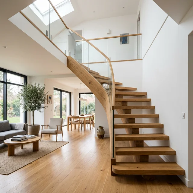 Le prix varie entre 3 500€ et 20 000€+ selon la complexite, l'essence de bois et les dimensions. Un escalier quart tournant standard en chene revient generalement entre 5 000€ et 9 000€ pose incluse. Votre devis est gratuit et sans engagement.